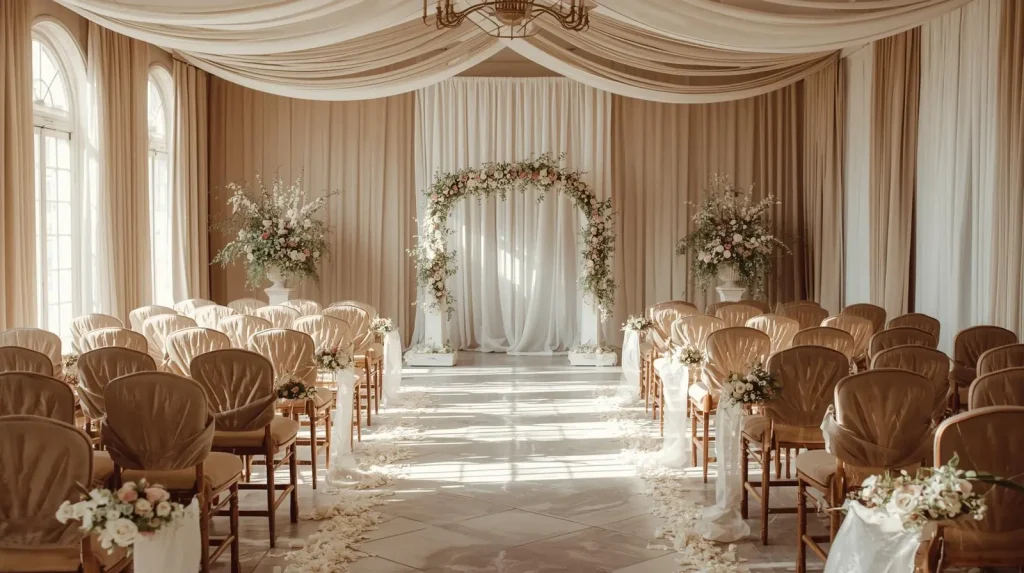 Acoustic wall panels, ceiling baffles, carpets, fabric drapes, and upholstered furniture significantly reduce echo during ceremonies and receptions.