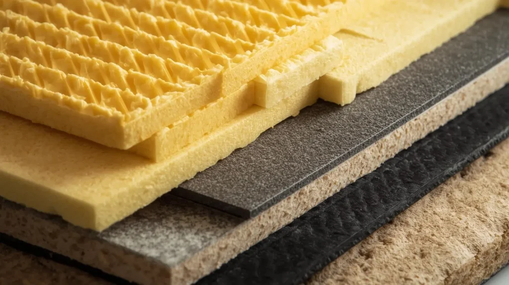 Each material plays a specific role in blocking noise and controlling vibrations within the space.