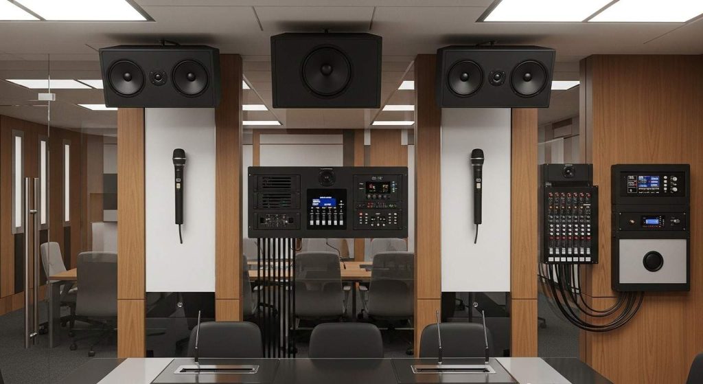 Excessive reflection reduces speech intelligibility. Voices overlap and create fatigue. A structured approach considers both the sound system and the room’s acoustic behavior. Absorptive panels, ceiling treatments, and proper speaker angling improve performance significantly.